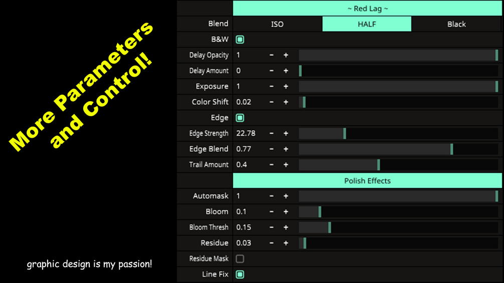 Over 16 parameters: Opacity, Color Hue, Black and White source, Delay Amount AND